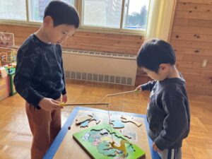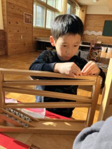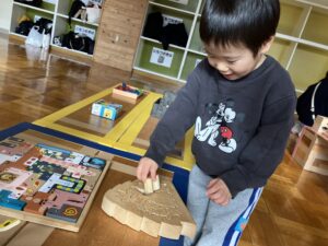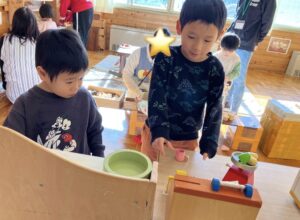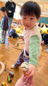 木のおもちゃのコーナーでは、おままごとや積み木、木の電車など、いろいろなおもちゃに子どもたちの目がキラキラ👀✨