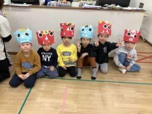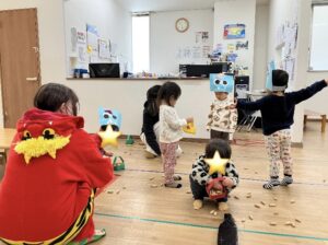 最初に節分の絵本の読み聞かせを行い、「鬼はそと!福はうち!」の掛け声を練習しました🎵