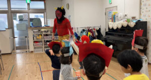 午前は小さい子が多いので、鬼の着ぐるみを着た先生が登場し豆まきスタート!