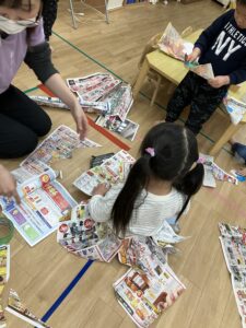 チラシを使って、ちぎったり、折ったり、テープで貼ったりしながら、自由に好きな形を作っていきます!!