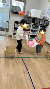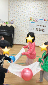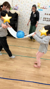 お友達のスピードやタオルの高さに合わせようとする様子もあり、相手の動きをよく見て調整する力が育まれています🌟